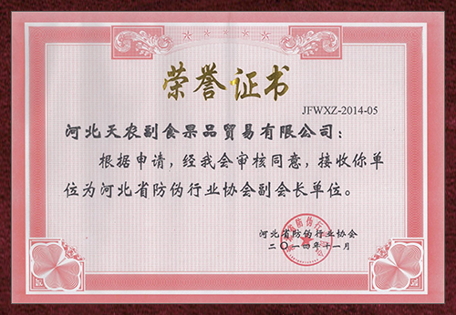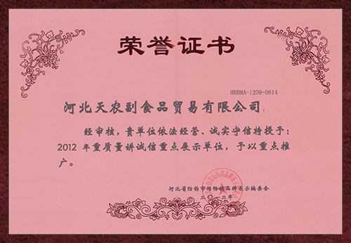“源于自然,享受綠色”是公司服務于社會始終如一的追求目標。近年來公司先后榮獲“中華名優新特農產品先進單位”、“中國優質食品安全單位”、“中國果品協會理事單位”、“河北省果品流通協會最佳會員單位”稱號。